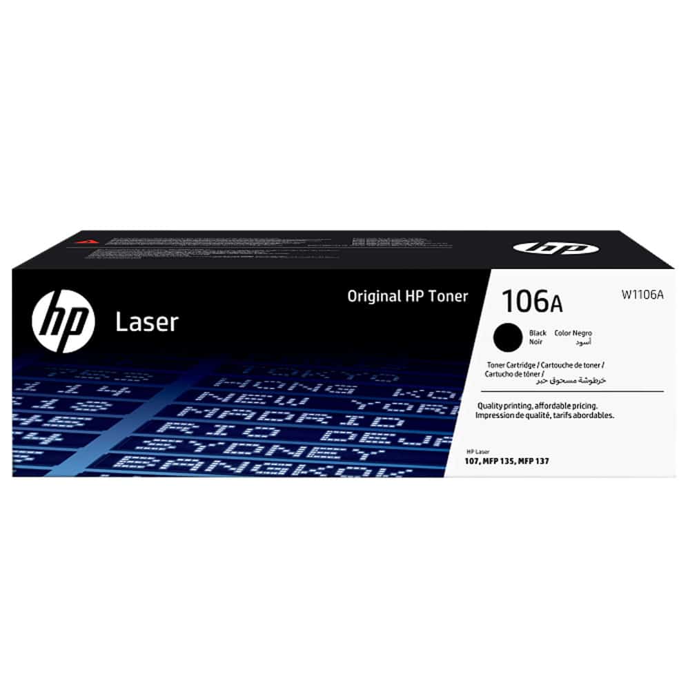 HP 106A (W1106A) orijinal toner, HP Laser 107 ve HP Laser MFP 135/137 serileri için tasarlanmış siyah lazer toner kartuşudur. ISO/IEC 19752 standardına göre 1000 sayfaya kadar verim sunar.